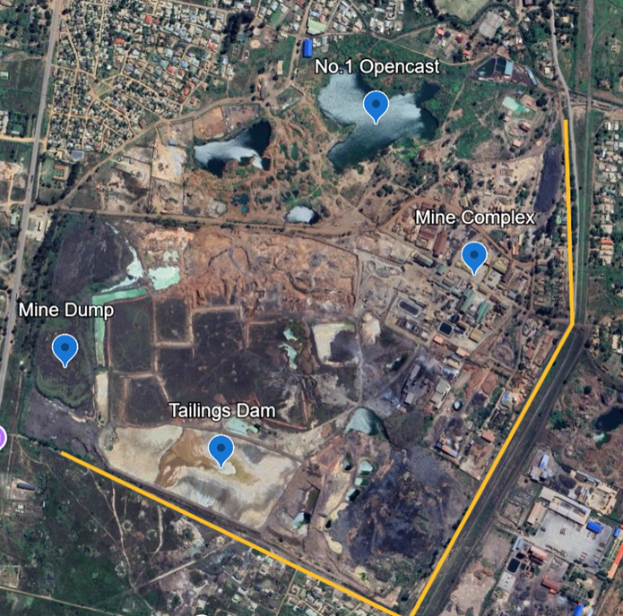 My next visits to the mine area only confirmed the striking pervasiveness of dust. In approaching the mine along the main road that leads to the town centre, I saw clouds of brown and grey dust above the trees and buildings. These were caused by the endless stream of open-topped trucks that were transporting toxic materials from the mine dumps and tailings dams of the Broken Hill Mine.[13] These trucks travelled at high speeds across a road that was strewn with potholes which meant that every bump caused a cloud of dust to fall to the ground getting into the eyes, nostrils and mouths of passing pedestrians.[14] The mine dumps and tailings dams of the Broken Hill Mine lie to the south of the main mine complex. When viewed on Google Earth this space appears to consist of large slabs of blackened earth and cream coloured pools of water. The former are the so-called “black mountain” mine dumps. These mounds consist of black slag produced during the smelting of lead and zinc concentrates which form hard black sand and pebbles which are tightly packed together.[15] The latter are the tailings dams which consist of the waste produced during an earlier phase of mineral processing. The dams consist of fine material of grounded rock mixed with water and chemicals.[16] These constitute the most visible signs of the wastage produced by decades of mining at Kabwe. The trucks that thundered past me were carrying these materials northwards away from the mining area but in doing so were responsible for spreading the lead contaminated dust even further.[17]